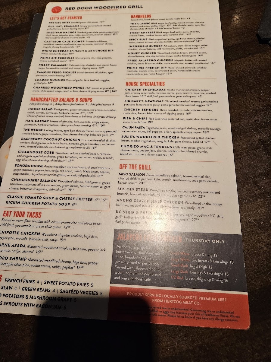 Woodfire grilled salmon, field greens, grape tomatoes, kalamata olives, cucumbers, green beans, , toasted almonds, goat cheese, balsamic vinaigrette, house chimichurri